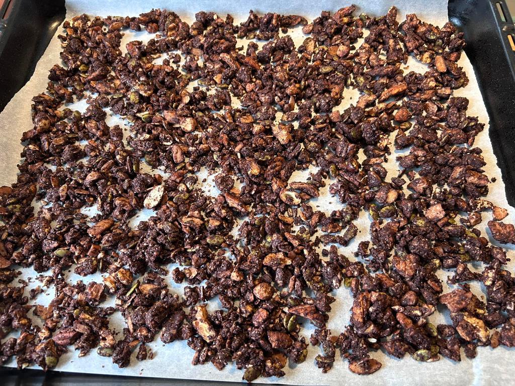 This is chocolate granola made with nuts, seeds, coconut oil, maple syrup, cocoa powder and spices – let me know if you’d like the recipe